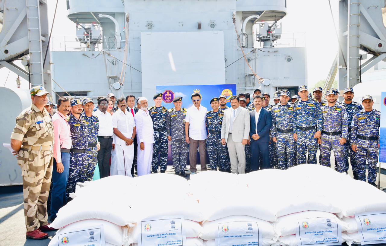 டிட் வா புயலால் கடுமையான பாதிப்பு உள்ளான இலங்கை மக்கள் உண்ண உணவும் உடைகளும் உறைவிடம் இன்றி நெருக்கடியான சூழலில் திக்கி தவித்துக் கொண்டிருக்கும் சூழலில் தமிழக அரசு சென்னை துறைமுகத்தில் இருந்து இலங்கை நாட்டிற்கு இந்திய கடற்படைக்கு சொந்தமான கப்பல்கள் மூலம் நிவாரண பொருட்களை அனுப்பி வைத்தது. என் நிகழ்வை நேரில் சென்று ஆய்வு செய்து அங்குள்ள பதிவேட்டில் தமிழக முதலமைச்சர் மு க ஸ்டாலின் கையெழுத்து விட்டார்.