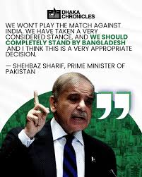 உலகக் கோப்பை டி20 போட்டியில் இந்தியாவுக்கு எதிராக திட்டமிடப்பட்ட லீக் போட்டியை தங்கள் அணி புறக்கணிக்கும் என்று பாகிஸ்தான் பிரதமர் ஷெபாஷ் செரிப் அதிகாரப்பூர்வமாக அமைச்சரவை கூட்டத்தில் தெரிவித்தார். இந்தியாவுக்கு பயணம் செய்ய மறுத்ததால் தொடரில் இருந்து நீக்கப்பட்ட வங்கதேச அணிக்கு ஆதரவு தெரிவிக்கும் வகையில் இந்த முடிவு எடுத்துள்ளதாகவும் அவர் குறிப்பிட்டுள்ளார் விளையாட்டு மைதானத்தில் அரசியல் இருக்கக் கூடாது என்றும் இது மிகவும் கவனமாக ஆலோசித்து எடுக்கப்பட்ட முடிவு வேண்டும் அவர் தனது முடிவு குறித்து விளக்கம் அளித்தார் இந்தியா மற்றும் இலங்கை இணைந்து நடத்தும் இந்த உலகக் கோப்பை தொடரில் பிப்ரவரி 15ஆம் தேதி இலங்கையின் கொழும்பில் இந்தியா பாகிஸ்தான் மோதவிருந்தது இந்தியாவுக்கு எதிரான போட்டியை புறக்கணித்தாலும் பாகிஸ்தான் அணி இந்த தொடரில் மற்ற போட்டிகளில் விளையாடும் என்றும் அந்நாட்டு அரசு கூறியுள்ளது. ஒரு போட்டியை மட்டும் புறக்கணிப்பது விதிமுறைகளுக்கு எதிரானது என்றும் இதனால் பாகிஸ்தான் கிரிக்கெட் வாரியம் கடும் நிதி இழப்பு மற்றும் தடையை சந்திக்க நேரிடும் என்றும் ஐசிசி எச்சரித்துள்ளது குறிப்பிடத்தக்கது